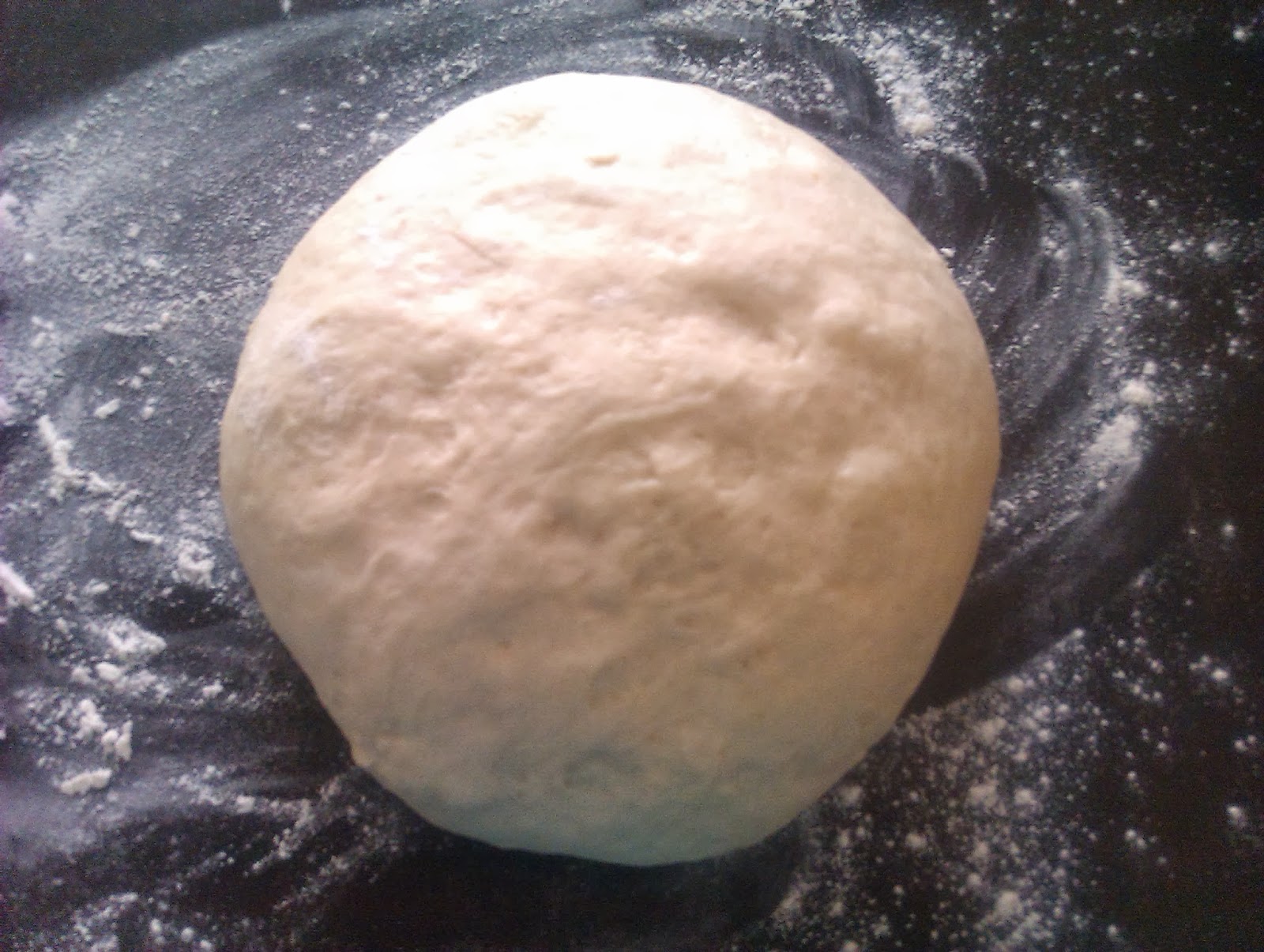 Die restlichen Zutaten zufügen und alles verkneten. Der Teig muss mindestens 10 Minuten gut durchgeknetet werden. Er sollte schön elastisch sein und sich vom Schüsselboden lösen.