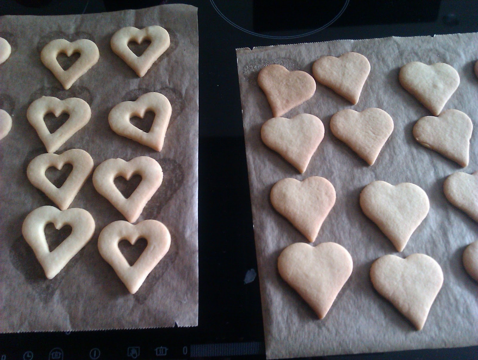 - Jeweils 1 Blech ganz lassen und ein Blech mittig mit kleinerem Herz ausstechen.