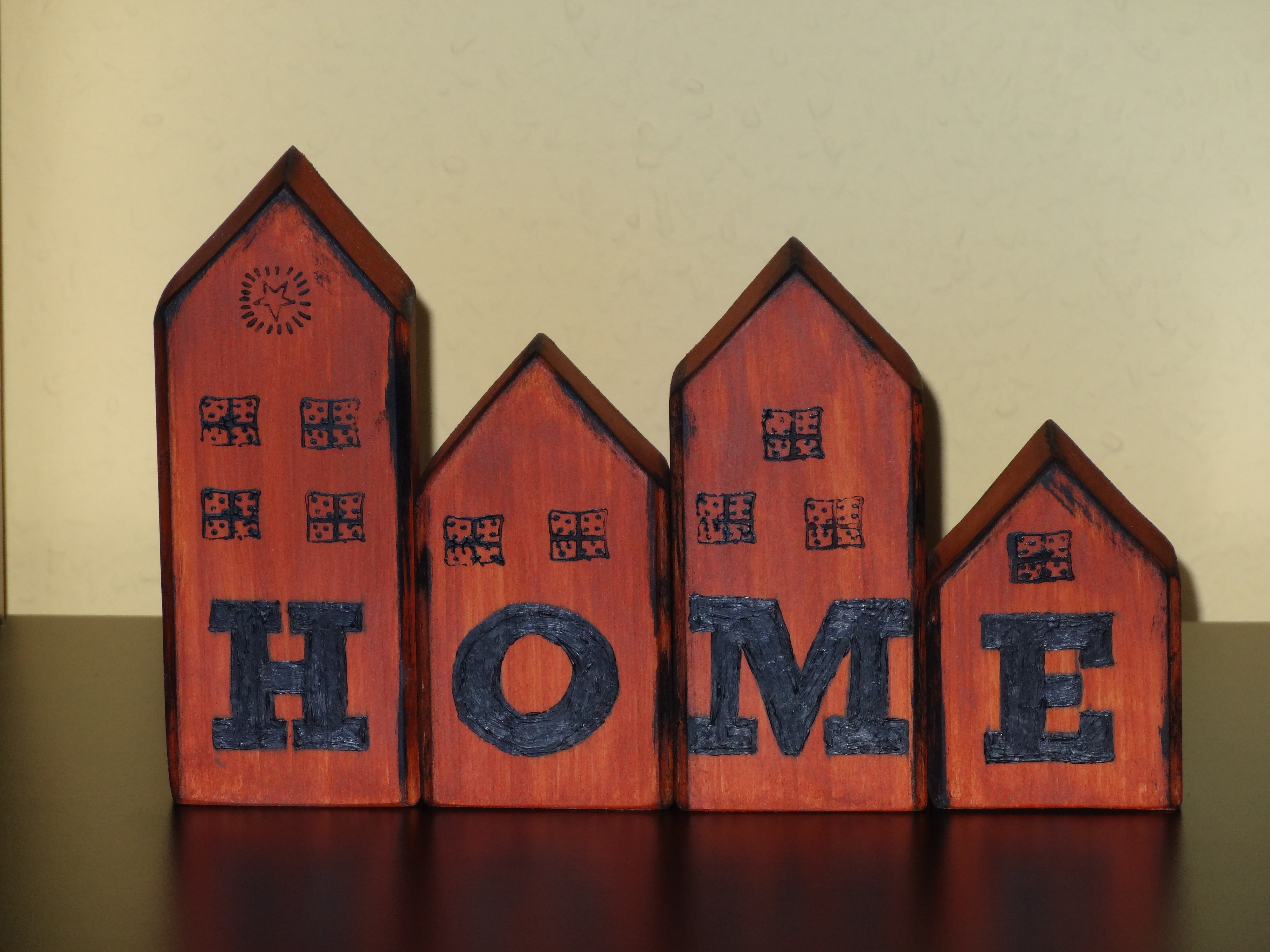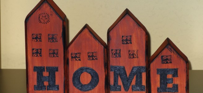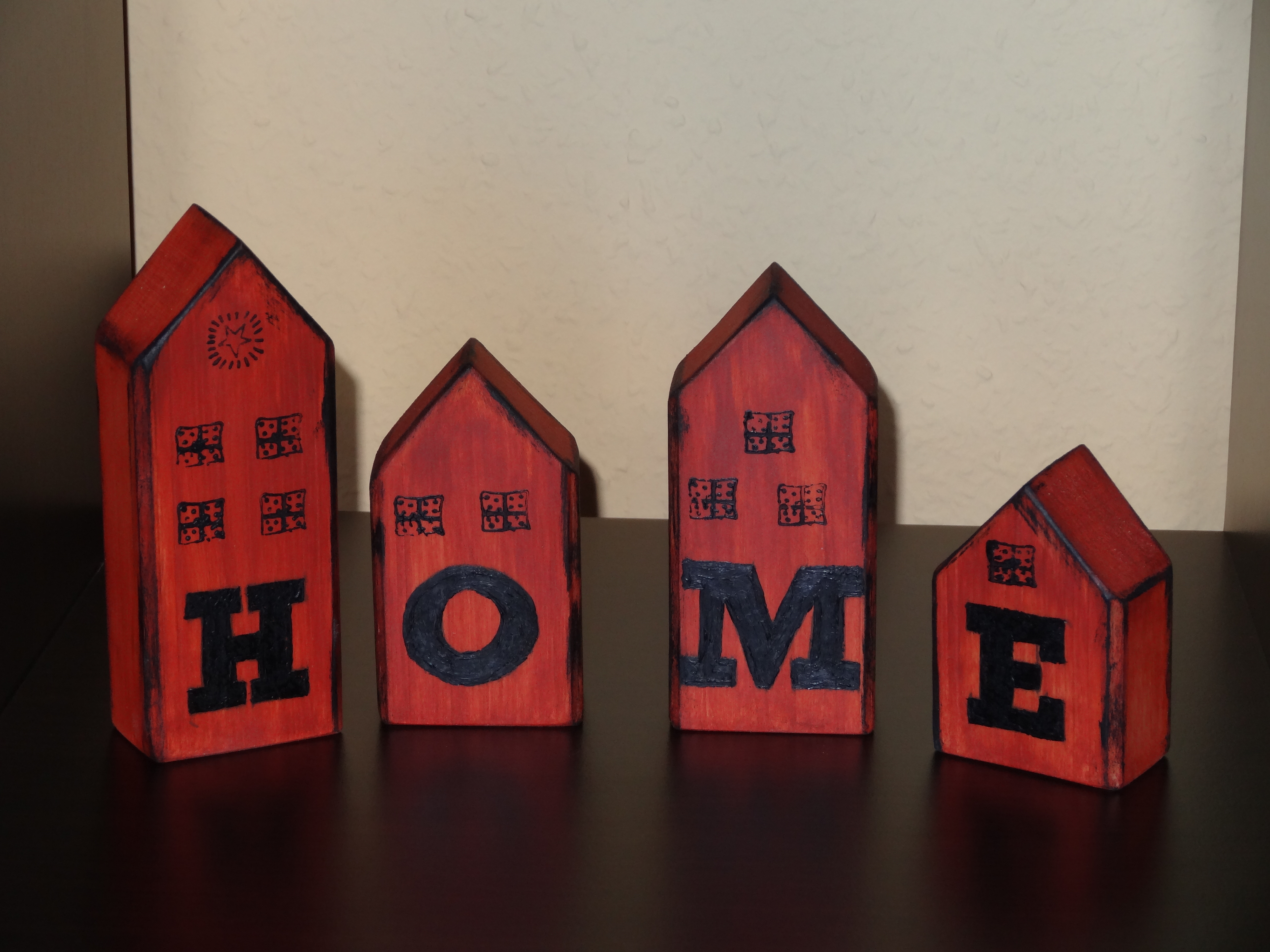 Die Häuschen sind aus einfachen Holzbalken gemacht und mit brauner Acrylfarbe bemalt. Die Fenster sind aufgedruckt und die Schrift hab ich mit Hilfe einer Schablone aufgemalt oder besser gesagt…getupft. So bekommt man durch das Unebene einen leichten Veloureffekt. Zum Schluss hab ich die Kanten etwas verwischt und schon waren die Häuschen fertig.