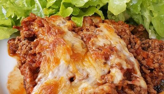 - Die Hälfte der Hackfleischsoße darauf verteilen.