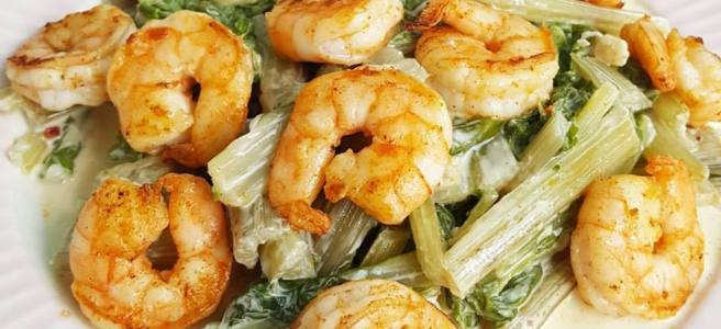 - Auf einem Teller anrichten und die Garnelen darauf verteilen.