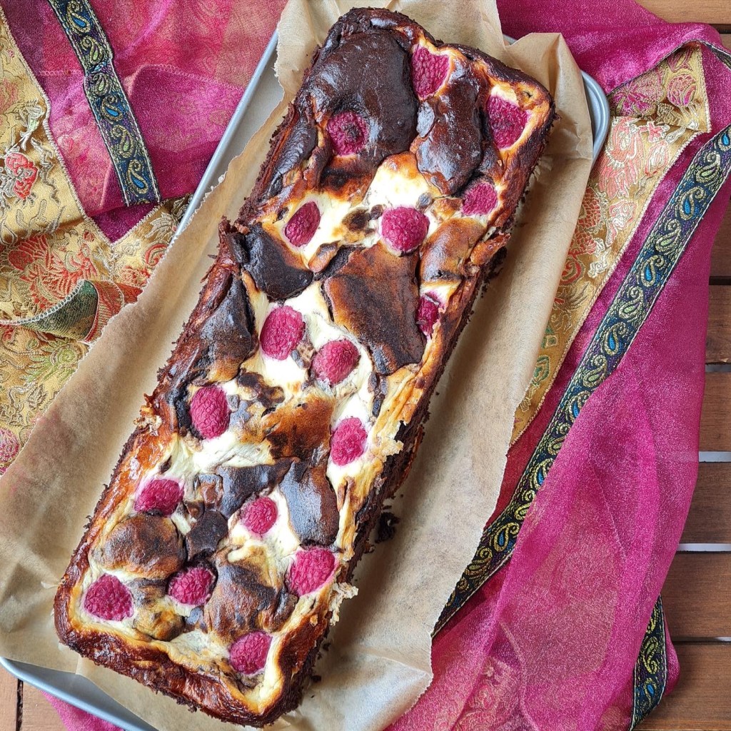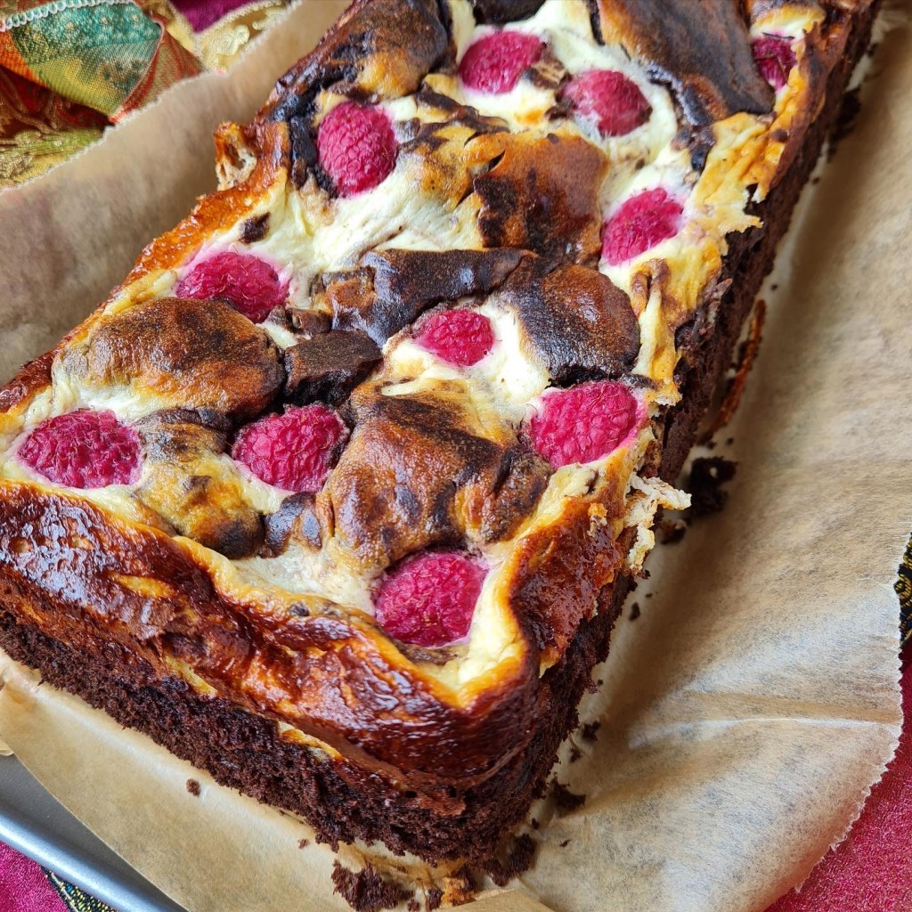 es gibt Quark Swirl Brownies mit Himbeeren.
