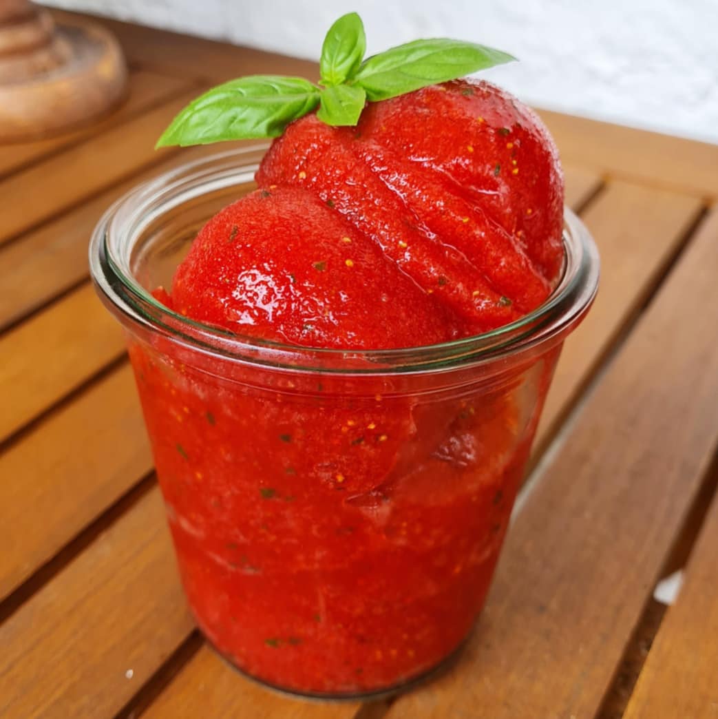 Und für die Dessert Variante 3 nimmst du das Rezept vom Erdbeersorbet und fügst 5 Blättchen Basilkum hinzu. Pürier sie einfach mit den Erdbeeren mit. Ab in die Eismaschine und nach 30 Minuten genießen.