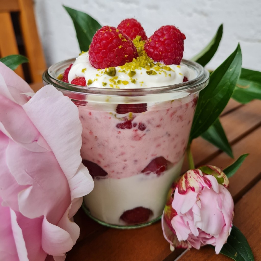 - Dann zusammen mit den übrigen Himbeeren abwechselnd in ein Glas oder eine Schale Schichten.