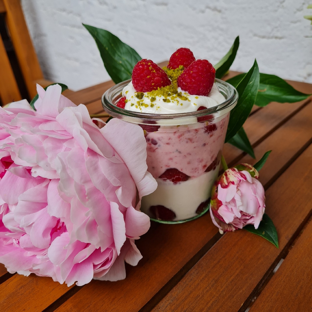 - Dann zusammen mit den übrigen Himbeeren abwechselnd in ein Glas oder eine Schale Schichten.
