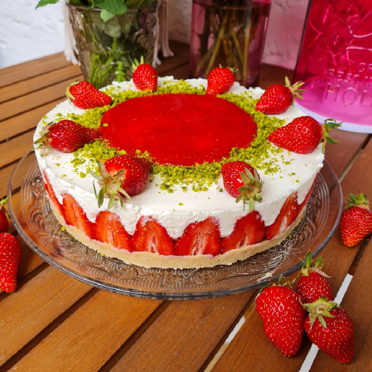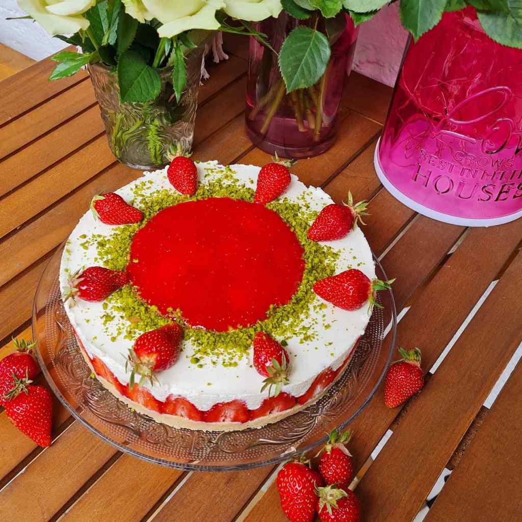 - Die Vanillesahne auf den Erdbeeren verteilen und mit Basilikum und gehackten Pistazien bestreuen.