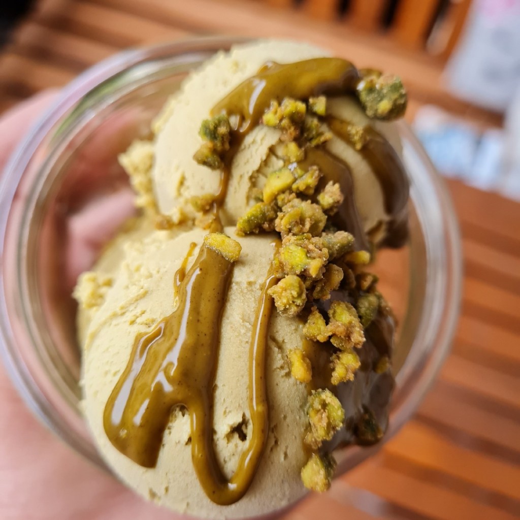 TIPP: Du kannst dir dein Eis noch mit gehackten Pistazien und etwas Pistazienmus toppen und wenn du magst noch ein Sahnekrönchen darauf geben. Ganz wie du es am liebsten magst.