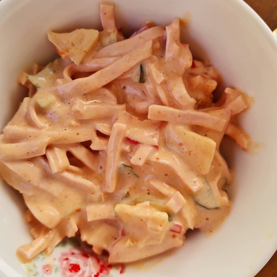 Wenn du mich schon etwas länger begleitest, dann ist dir sicherlich schon längst aufgefallen, dass ich total auf Wurstsalat stehe. Ich könnte mich tagelang nur davon ernähren. Ich hab inzwischen zig Varianten entwickelt und unter anderem ist da auch der heutige Budapester Fleischsalat dabei. „Fleischsalat“ deshalb, weil er in einem leckeren Mayo-Dressing badet. Die Kombination der einzelnen Zutaten ist so lecker.