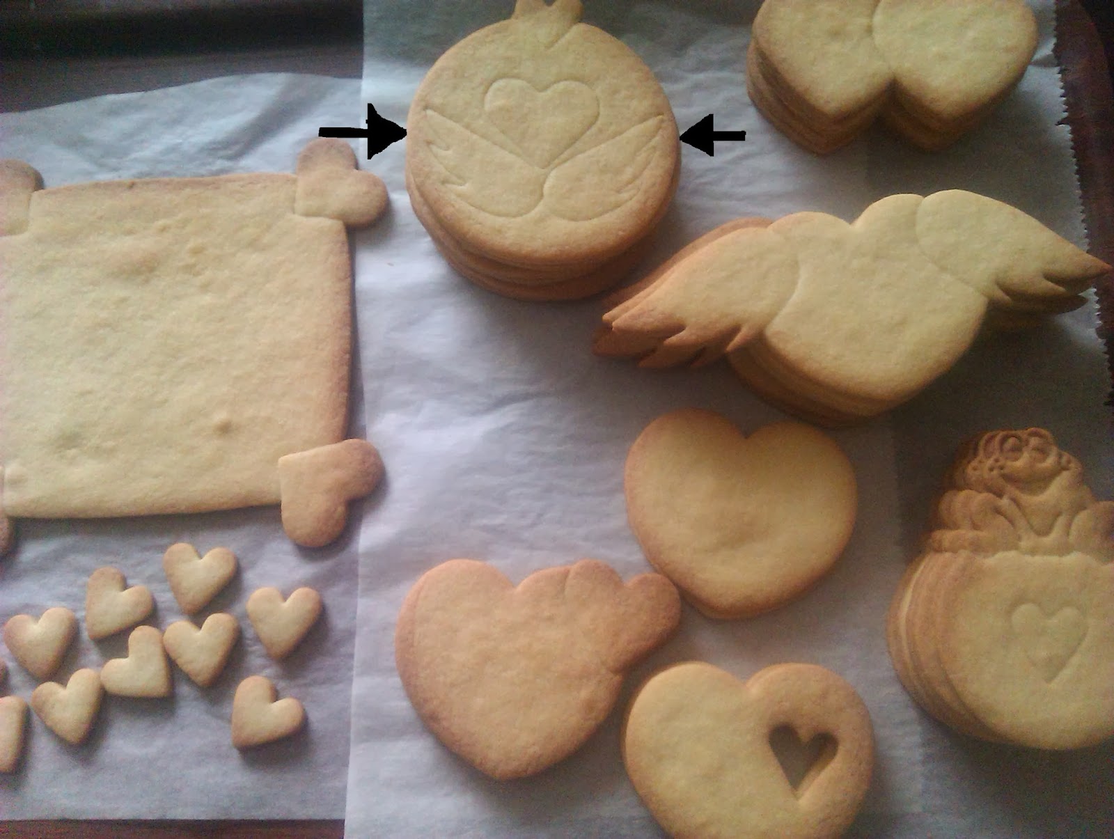 Jetzt zeig ich noch einen Trick…damit man nach dem backen nicht zusätzliche Arbeit mit dem zeichnen von Hilfslinien hat, nehmen wir einen Herz- und einen Flügelausstecher und ritzen die Kekse ganz leicht an. Auf dem Bild seht ihr ganz oben die Hilfslinien auf den Keksen, so soll das dann aussehen. Ein paar andere Beispiele für Sugar Cookies sind auch mit drauf.